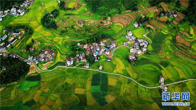 廣西隆林各族自治縣克長鄉(xiāng)海長村的秋稻即將成熟(9月1日無人機拍攝)。 新華社記者張愛林攝