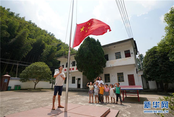 9月4日,在蘆嶺教學(xué)點(diǎn),陳云根(后)和黃文春(前)帶著全校6名學(xué)生升國(guó)旗?,F(xiàn)在學(xué)校操場(chǎng)已經(jīng)鋪上了水泥。新華社記者 宋振平 攝