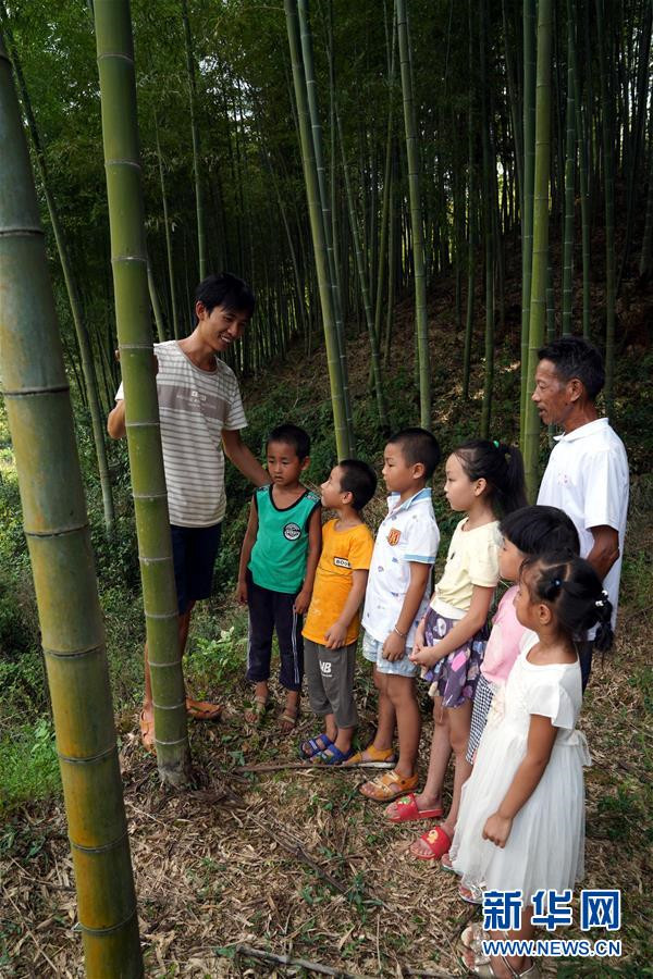 9月4日,黃文春(左一)和陳云根帶著學(xué)生們來到學(xué)校附近的山林,為孩子們講解竹子的生長(zhǎng)過程。 新華社記者 汪明麗 攝