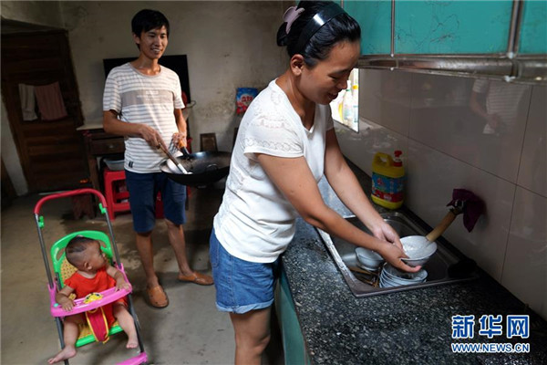 9月4日,在黃文春家中,黃文春和妻子歐陽沙在廚房做飯。黃文春2011年與同學(xué)歐陽沙結(jié)婚后,就把根扎在了蘆嶺,幾次放棄了考試進(jìn)城教書的機(jī)會(huì)。 新華社記者 宋振平 攝