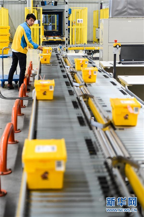 在江蘇南京蘇寧云倉物流基地,工作人員將包裝好的“共享快遞盒”放到傳送帶上,準(zhǔn)備進行分揀運輸(2017年10月31日攝)。新華社記者 李博 攝