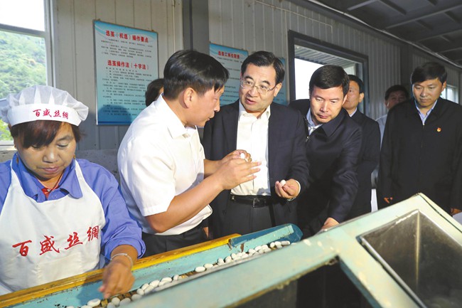鎮(zhèn)安縣是深度貧困縣,自然條件差,貧困人口多,脫貧難度大。胡和平首先來(lái)到永樂街道辦事處中合村永田農(nóng)業(yè)發(fā)展公司,實(shí)地調(diào)研食用菌產(chǎn)供銷一體化脫貧項(xiàng)目,詳細(xì)了解產(chǎn)品生產(chǎn)工藝和銷售情況,鼓勵(lì)企業(yè)擴(kuò)大生產(chǎn)規(guī)模,提升品牌價(jià)值,做大海外市場(chǎng),在提高效益的同時(shí)增強(qiáng)帶動(dòng)群眾增收能力。在百盛繅絲廠,胡和平聽取公司生產(chǎn)經(jīng)營(yíng)和脫貧幫扶情況介紹,了解選繭、煮繭、繅絲、復(fù)整等生產(chǎn)流程,并與前來(lái)出售蠶繭的農(nóng)民張秀成交談。當(dāng)聽說(shuō)張秀成今年養(yǎng)繭收入6000多元,胡和平十分高興。他希望企業(yè)依托商洛青山綠水,發(fā)展綠色產(chǎn)業(yè),延長(zhǎng)產(chǎn)業(yè)鏈條,帶動(dòng)更多群眾擺脫貧困。