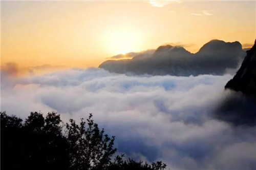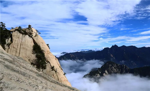 華山的云多變化。有時(shí),天空晴朗,山腰間浮著幾朵白云,像鳥(niǎo)兒在盤(pán)旋;有時(shí),一帶云霧纏繞在峰嶺間,絲絲縷縷,如纖纖玉女般纏綿而多情;有時(shí),山谷間被云霧填滿,僅露出一個(gè)山尖兒置身其間宛若在仙宮別苑;有時(shí),云海茫茫,云波涌蕩,恍若隔世;有時(shí),云霧包裹了山巒,人就在云中,移步生煙、吐納含瑞被云霧挾裹著,忘記了塵器的凡俗,忘記了世事的究雜,身心全都融化在了這超然的情境當(dāng)中。
