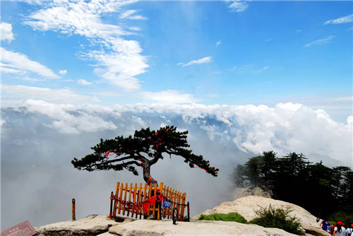 漫步于華山的峰嶺山道,到處可以看到許多與云有關(guān)的景點(diǎn),也能從與云有關(guān)的神奇?zhèn)髡f(shuō)中,感受到宛若仙境的景象。五云峰是華山諸峰中最富有詩(shī)情畫(huà)意的一座峰嶺。每逢深秋季節(jié),松翠楓赤,山花耀目,在太陽(yáng)光的照射下,猶如五色彩云,霓裳般妝扮了山的容顏。在這里,松楓山花都成了五彩云霧。而位于云臺(tái)峰以北的白云峰,山峰的若石就如白云一樣漂浮在空中。傳說(shuō)漢元帝劉爽的女兒南陽(yáng)公主為避離亂之苦,遠(yuǎn)離塵露,就到白云峰隱居修行,修煉功成,駕鶴乘云而去。