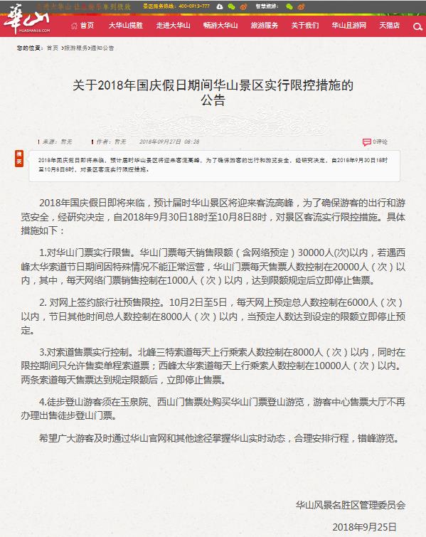 2018年國慶假日即將來臨,預(yù)計(jì)屆時(shí)華山景區(qū)將迎來客流高峰,為了確保游客的出行和游覽安全,經(jīng)研究決定,自2018年9月30日18時(shí)至10月8日8時(shí),對(duì)景區(qū)客流實(shí)行限控措施。具體措施如下: