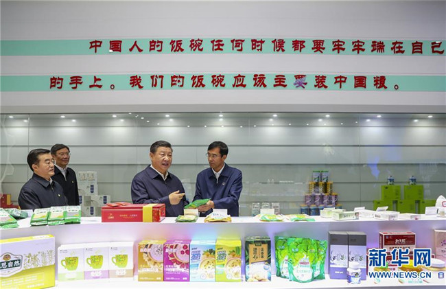 在一樓展示大廳,當(dāng)?shù)爻霎a(chǎn)的米油豆奶等各類(lèi)農(nóng)產(chǎn)品琳瑯滿(mǎn)目,習(xí)近平逐一察看,強(qiáng)調(diào)中國(guó)人的飯碗任何時(shí)候都要牢牢端在自己的手上。他雙手捧起一碗大米,意味深長(zhǎng)地說(shuō)道:“中國(guó)糧食!中國(guó)飯碗!”
