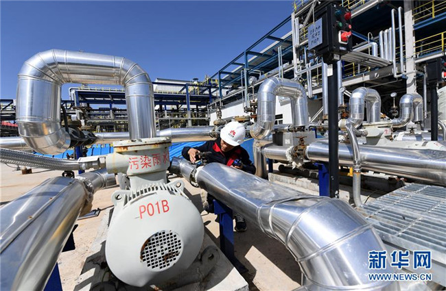 延安煤油氣資源綜合利用項(xiàng)目甲醇制烯烴中心的工作人員在進(jìn)行設(shè)備巡檢(9月28日攝)。新華社記者 劉瀟 攝