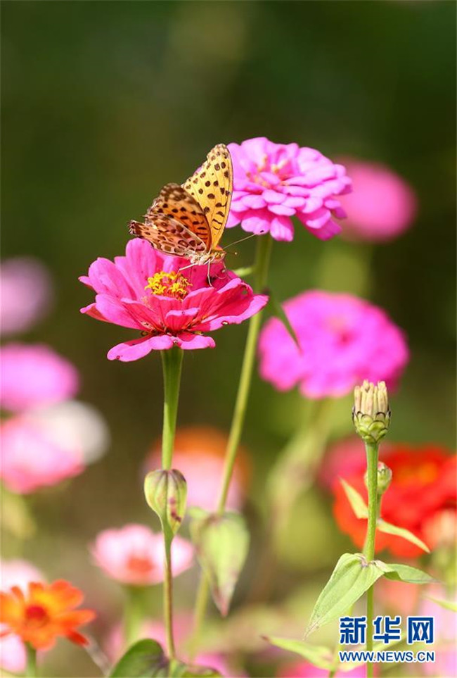 10月9日,在福建省泉州市德化縣桂陽(yáng)鄉(xiāng)一家生態(tài)園,百日菊競(jìng)相開(kāi)放,引得蝴蝶蹁躚而至。 新華社發(fā)(張九強(qiáng) 攝)