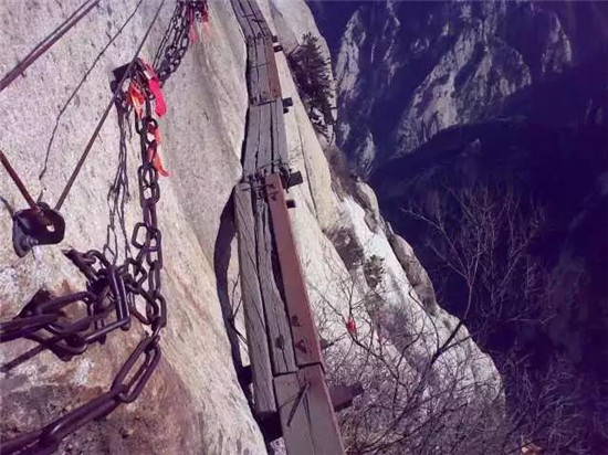 金鎖關(guān):到達(dá)金鎖關(guān)時(shí),眼前大片大片的紅色,游人的視覺和心靈受到強(qiáng)烈的沖擊。這是沿路兩邊鐵鏈上綁滿的密密麻麻的紅色絲繩,不留一絲空隙,風(fēng)吹來,長長的紅色絲繩就輕盈的舞起來,如愛情牢固的臂膀,甜蜜的飛翔在華山之上。讓一把感情鎖和華山一同到地老天荒,成為一個(gè)“山無陵,天地絕,乃敢與君絕”的千古情愛神話。