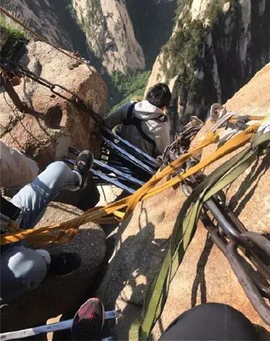 鷂子翻身:這條據(jù)說坡度在120度的懸崖峭壁主要靠臂力,只能用手抓著鐵鏈,腳摸索著探路。人是從上往下攀緣,崖壁往里傾,從上往下望,只有云,只有山峰,什么都不見。這里的可怕在于你不知腳下的路,更無法預(yù)知危險(xiǎn),一不留神就會兩腳懸空,被保險(xiǎn)繩吊在空中。