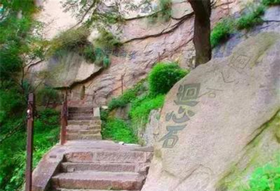 韓愈投書處:從北峰上行,過擦耳崖,爬天梯,就到了蒼龍嶺,這處地方就像它的名字一樣,仿佛是一條蒼龍用它的背脊架起了這條路,路面極之狹窄,若有人迎面擦肩而過,最好大家互相背靠背遷就一下,免生危險(xiǎn)。蒼龍嶺的山脊上下高差約五百米,山坡傾斜度達(dá)45度,兩旁山谷,深不可測,據(jù)說唐代韓愈當(dāng)年上山到了此地,見山高勢險(xiǎn),以為自己必死無疑,于是寫下遺書,投往山下,所以大家會發(fā)現(xiàn)路旁一塊巨石之上,寫有“韓愈投書處”的字樣。