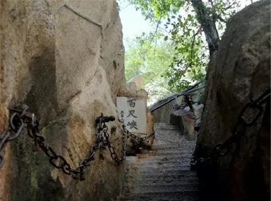 千尺幢:一條陡峭的鳥道從懸崖穿過,僅能容兩人上下,坡度成一條垂直的線,372個(gè)臺階向天而上,就像一頭瘦骨嶙峋的老牛的肋骨,承載了數(shù)不清游人沉重的腳步。弓著身子努力向上攀爬的時(shí)候,雙手使勁拉住了旁邊的鐵鏈,嘩啦嘩啦的聲音始終在千尺幢這里回響著,除去鐵鏈的聲響,這條鳥道充滿的是小心翼翼的安靜,偶爾有人喊一聲,也是脫口而出的叮嚀和提醒。