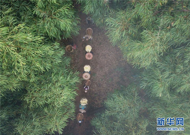 10月14日,在貴州赤水市寶源鄉(xiāng)聯(lián)華村,竹農(nóng)將采挖的竹筍背下山(無(wú)人機(jī)拍攝)。金秋時(shí)節(jié),貴州省赤水市寶源、兩河口、丙安等鄉(xiāng)鎮(zhèn)種植的5萬(wàn)余畝大竹筍迎來(lái)收獲季。當(dāng)?shù)刂褶r(nóng)加緊采挖竹筍,進(jìn)行加工后外銷。素有“中國(guó)竹子之鄉(xiāng)”的赤水市,現(xiàn)有竹林面積132.8萬(wàn)畝。竹產(chǎn)業(yè)已經(jīng)成為當(dāng)?shù)孛撠氃鍪盏闹饕乐弧?(王長(zhǎng)育 攝)