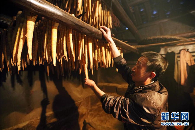 10月14日,在貴州赤水市寶源鄉(xiāng)聯(lián)華村,竹農(nóng)翻看烘烤的竹筍。金秋時(shí)節(jié),貴州省赤水市寶源、兩河口、丙安等鄉(xiāng)鎮(zhèn)種植的5萬(wàn)余畝大竹筍迎來(lái)收獲季。當(dāng)?shù)刂褶r(nóng)加緊采挖竹筍,進(jìn)行加工后外銷。素有“中國(guó)竹子之鄉(xiāng)”的赤水市,現(xiàn)有竹林面積132.8萬(wàn)畝。竹產(chǎn)業(yè)已經(jīng)成為當(dāng)?shù)孛撠氃鍪盏闹饕乐弧?(王長(zhǎng)育 攝)