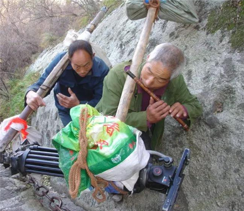 一副扁擔、一根長繩,或者一個背簍、一根登山用的手杖就是華山挑山工掙錢養(yǎng)家的家伙什。