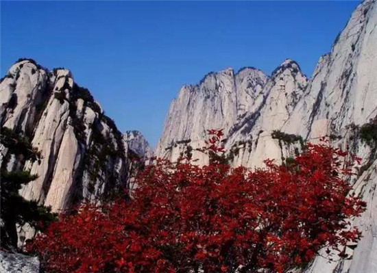 華山的紅葉浪漫而熾烈,她使蕭瑟的群山充滿了生機(jī)和活力。那些五角楓樹和黃櫨葉子在薄暮中分外地紅著,在陽(yáng)光中到處閃動(dòng)著鮮紅的翅膀,想要與彩霞或夕陽(yáng)一起飛翔。人們猜想,那一定是調(diào)皮的小廝盜了弄玉的胭脂潑在了山坡上,要不然,華山的紅葉紅葉何以會(huì)漫山遍野,何以會(huì)如此熾紅而且多情。