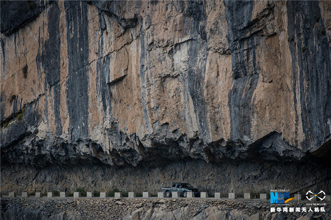 經(jīng)過一年多的時(shí)間,村民終于人工鑿出這條595米的懸崖公路,給當(dāng)?shù)貛砹讼M?。新華網(wǎng) 李相博 攝