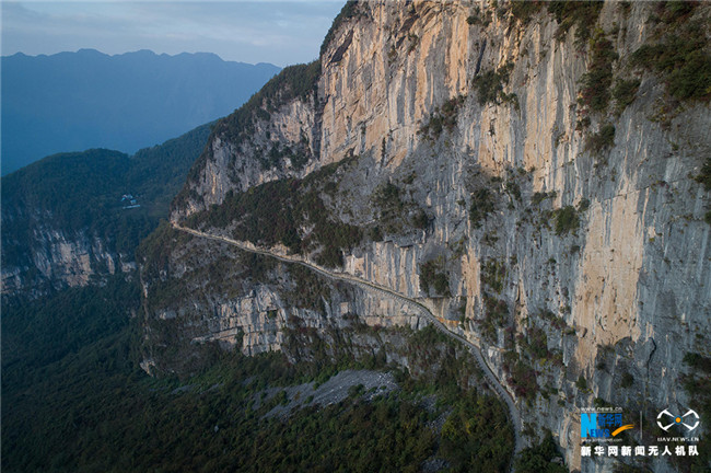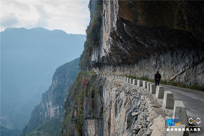 稱其“懸崖天路”,來源于其險(xiǎn)要的地勢——上方是巖石,外側(cè)是懸崖峭壁。由于地處海拔1500米的高山,常有云霧繚繞,驚險(xiǎn)萬分。新華網(wǎng) 李相博 攝