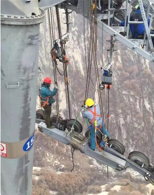 當(dāng)發(fā)現(xiàn)索道支架有異響時(shí),維護(hù)工就要上支架了。從檢修車車廂里翻出來、順著掛在鋼索下的車臂攀緣上去,越過鋼絲繩,跨上支架,維護(hù)工開始工作。最高的支架65米,站在高聳入云的支架上,有一種站在懸崖邊的感覺。
