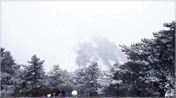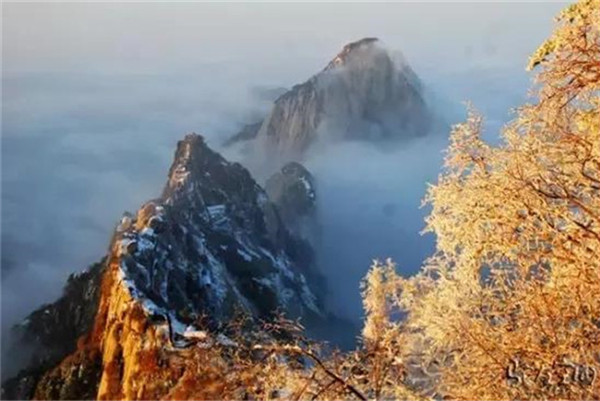 當(dāng)滿山的紅葉還依舊掛在樹枝,露出嬌羞的笑臉時(shí),秋末的華山,已經(jīng)下起了今年的第一場雪。放眼望去,整座山體好像被薄薄的彩衣包裹,若隱若現(xiàn)。