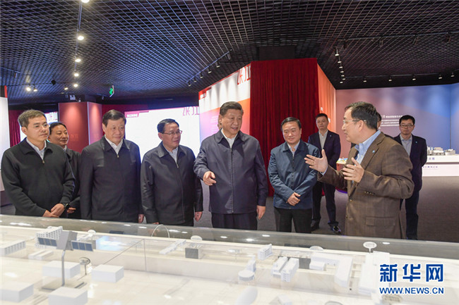 這是6日下午,習(xí)近平在張江科學(xué)城展示廳考察,了解上海科技創(chuàng)新和科技成果轉(zhuǎn)化情況。 新華社記者 謝環(huán)馳 攝
