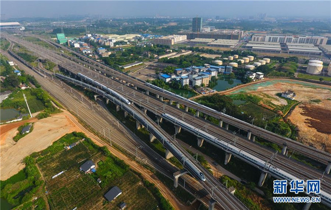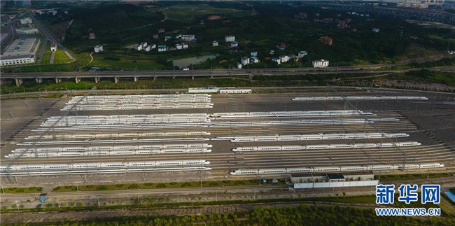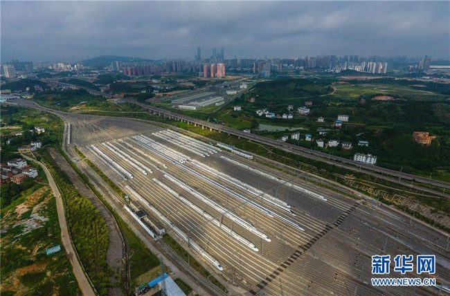 這是廣西南寧動車所內(nèi)準(zhǔn)備發(fā)往各地的動車組列車(7月1日無人機拍攝)。