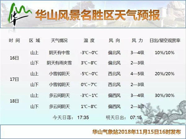 據(jù)天氣預(yù)報(bào)顯示,華山今、明兩日會有降雪天氣: