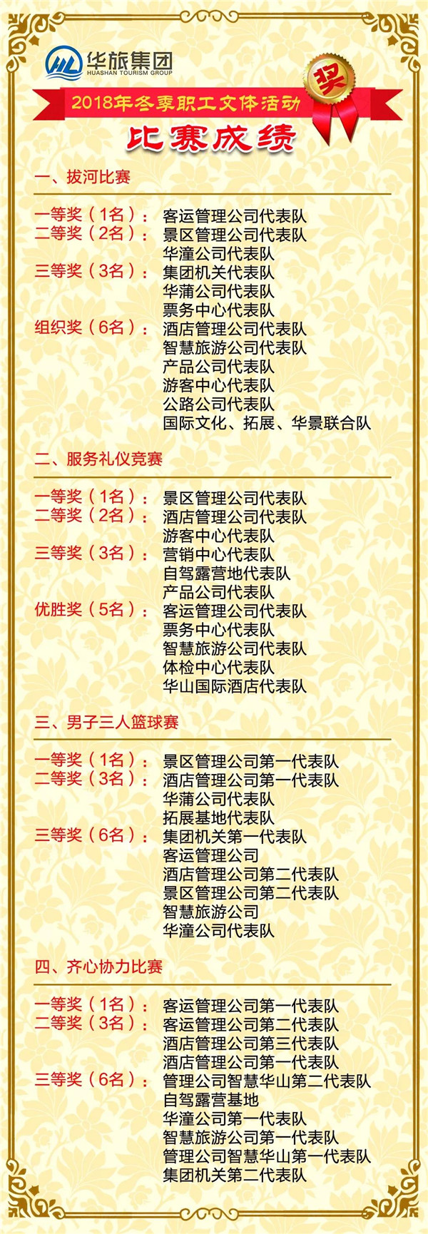 經(jīng)過(guò)近一個(gè)月的激烈角逐,各單位在男子3VS3籃球賽、齊心協(xié)力賽、服務(wù)禮儀競(jìng)賽、拔河比賽中表現(xiàn)突出,成績(jī)優(yōu)異。在活動(dòng)舉辦過(guò)程中,參賽隊(duì)員們以飽滿(mǎn)的熱情,積極踐行“卓越、友誼、尊重、低碳”的體育理念,充分體現(xiàn)了集團(tuán)廣大職工積極向上、勇于擔(dān)當(dāng)、頑強(qiáng)拼搏、奮發(fā)有為的精神風(fēng)貌。同時(shí),景區(qū)管理公司、客運(yùn)管理公司、酒店管理公司、產(chǎn)品開(kāi)發(fā)公司、智慧旅游公司、游客中心、票務(wù)中心等單位分別組織開(kāi)展了各項(xiàng)文體活動(dòng)及勞動(dòng)技能競(jìng)賽,活動(dòng)突出崗位特點(diǎn),形式多樣,各具特色。近期,集團(tuán)還將開(kāi)展雙語(yǔ)服務(wù)互動(dòng)、人人講華山等活動(dòng),在集團(tuán)上下?tīng)I(yíng)造健康生活、快樂(lè)工作的良好氛圍。