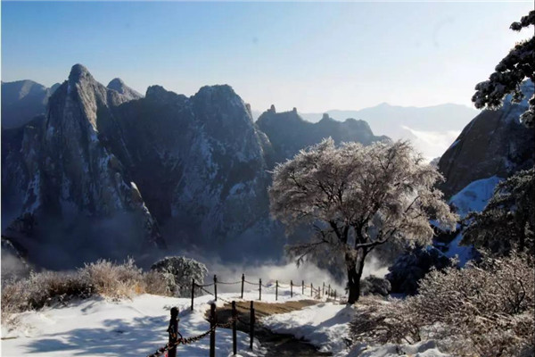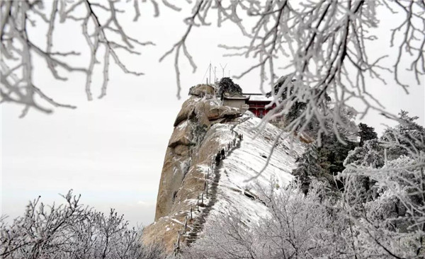 雪落華山,圣潔的雪花把華山妝扮得分外妖嬈嫵媚,平日陡峭的巖石,象穿著潔白的羽衣,宛若天仙般亭亭玉立于峰頭路旁,似向游人拂疑,微笑致意,最讓為之從心里震顏起敬的是,華山雪中松樹的雄姿與風情。