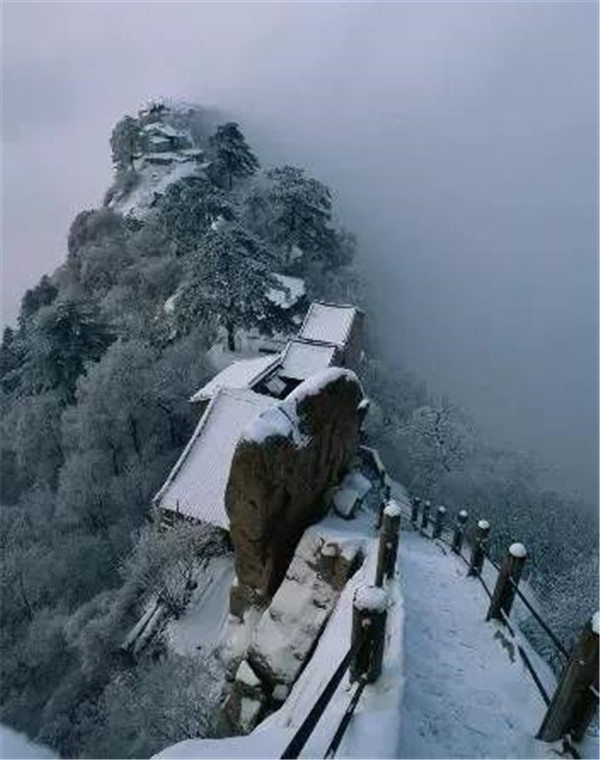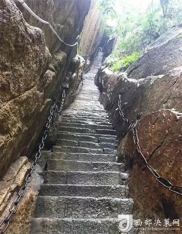 再經(jīng)上天梯、日月崖等險道便是著名的蒼龍嶺。它是通往華山東、南、中、西諸峰的必經(jīng)險道,其長不足l千米,寬僅1米左右,兩邊是萬丈深淵,游人走到如此奇險無比的嶺脊,每每令人怯步。傳說唐朝詩人韓愈,來到此地,為此險境嚇得嚎陶大哭,把隨身帶的詩稿和與家人訣別的遺書一起丟下崖去,至今崖上還刻有“韓愈投書處”諸字。