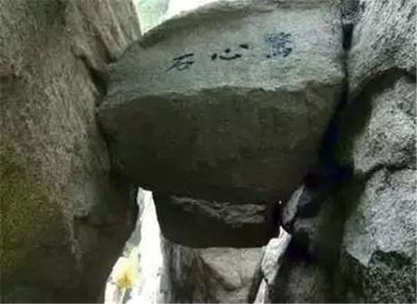 出千尺幢并不遠,便是百尺峽,這里是登山的第二道險關,兩壁高聳,中夾有一塊崩落下來的巨石,人從石下過,驚心動魄,抬頭望去,石上題有“驚心石”三個大字。