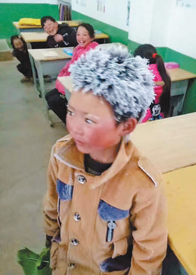 去年初,小滿(mǎn)因?yàn)轭^頂著冰霜上學(xué)而被稱(chēng)為“冰花男孩”?!≠Y料圖片 |