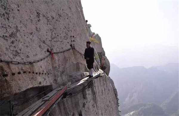 長空棧道位于南天門外,是華山著名險道之首。棧道分三段:南天門石坊至朝元洞西,路依崖鑿出,長20米,寬二尺許,為上段。折而下,崖隙橫貫鐵棍,形如凌空懸梯,游人須挽索逐級而下,稱之"雞下架",是為中段。再西折為下段,筑路者在峭壁上鑿出石孔,楔進石樁,石樁之間架木椽三根,游人至此,須面壁貼腹,腳踏木椽橫向移動前行。長空棧道是華山險道中險中之險。