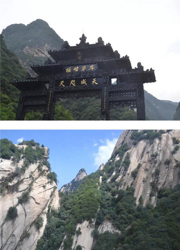 往西可去往中峰,往南可順原路返回,因暴雨如注,只得放棄攀爬中峰。順原路經(jīng)鷂子翻身,孩子仍念念不忘:“媽媽?zhuān)@會(huì)兒大暴雨,肯定沒(méi)人排隊(duì),咱們?nèi)シ_子翻身!”聽(tīng)了孩子“初生牛犢不畏虎”的話,我不由哈哈大笑:“小傻瓜!這么大的暴雨,有誰(shuí)去翻鷂子翻身呢?不要命啦?”在鷂子翻身入口處,孩子還是萬(wàn)般眷戀地探身查看,當(dāng)看到還未來(lái)得及撤離的人員身系保險(xiǎn)繩懸掛在峭壁上,就像風(fēng)雨中掉著蛛絲的蜘蛛,被風(fēng)雨襲擊的無(wú)處藏身、進(jìn)退兩難,方才知道了害怕。