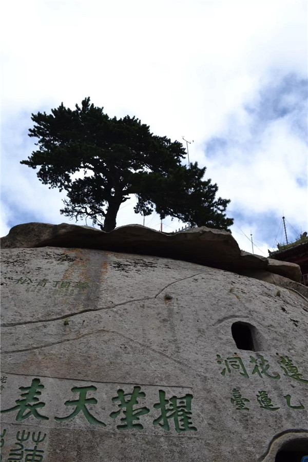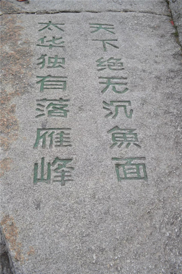 在南峰頂,孩子看到“天下絕無(wú)沉魚(yú)面,太華獨(dú)有落雁峰”的題刻,打趣我:“媽媽?zhuān)憬续櫻?,這里又叫落雁峰,真是和你有緣呢!快來(lái)這塊大石頭上落落腳,歇一歇!”“好啊!咱倆都爬累了,都歇一歇!”我為孩子的體貼欣慰!