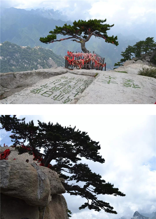 經(jīng)煉丹爐、孝子峰,云霧悄悄退隱,我們向南峰頂挺進(jìn)。南峰蒼翠秀麗,沿途的華山松千姿百態(tài),引人注目。華山迎客松生長(zhǎng)于懸崖峭壁的石縫中,向懸崖一側(cè)伸出虬勁的枝干,就像好客的秦人伸出有力的大手歡迎遠(yuǎn)道而來(lái)的客人。虬枝龍形的枝干上,是綠意盎然的松針,根根好像要刺破天穹。華山迎客松在藍(lán)天白云的映襯下,仿如碧玉雕琢而成,綠的耀眼,秀挺卓然!