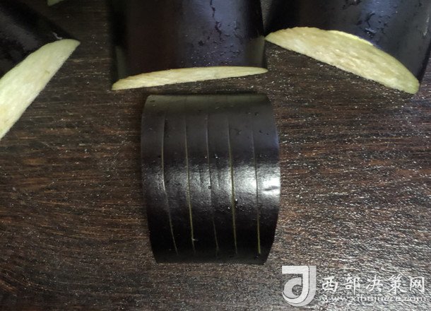 2.買回的大茄子洗凈,對半切開,取一半茄子先切6刀,前5刀不要切斷,第6刀切斷即可