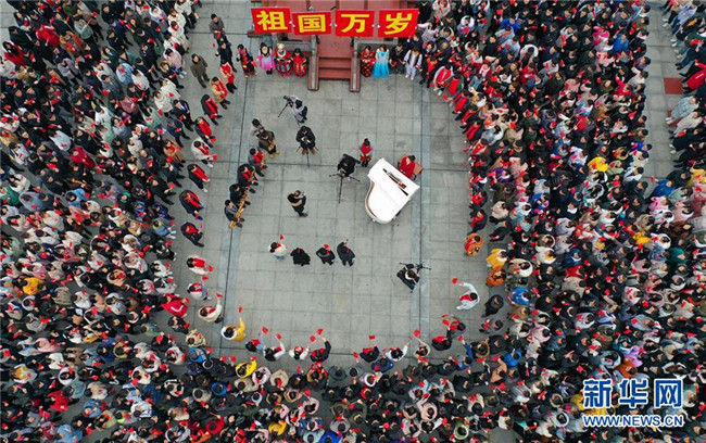 2月25日,湖南省衡陽(yáng)市南華大學(xué)師生在開(kāi)學(xué)主題活動(dòng)上齊唱《我和我的祖國(guó)》(無(wú)人機(jī)拍攝)。 新華社發(fā)(曹正平 攝)