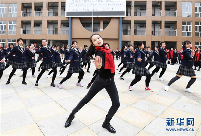 2月25日,貴州省貴陽(yáng)市南明區(qū)甲秀高中的師生在開(kāi)學(xué)主題活動(dòng)上表演“快閃”節(jié)目《我和我的祖國(guó)》。新華社發(fā)(趙松 攝)