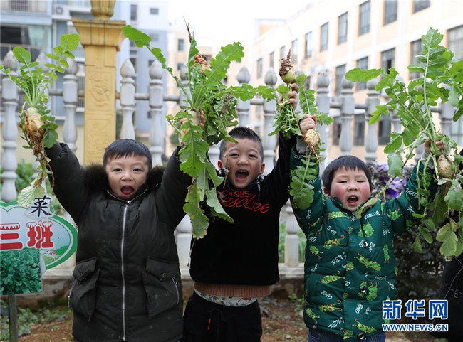 2月25日,在貴州省銅仁市玉屏侗族自治縣平溪街道第二幼兒園,孩子們?cè)陂_(kāi)學(xué)主題活動(dòng)上展示自己拔的蘿卜。新華社發(fā)(胡攀學(xué) 攝)