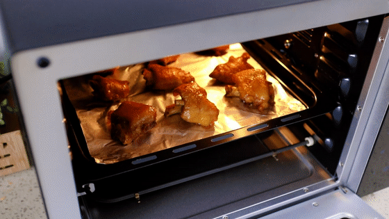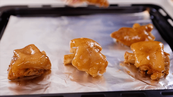 6.將烤盤上鋪上錫紙,并在錫紙上抹上一層薄薄的油,防止烤的時(shí)候豬蹄會(huì)粘在錫紙上,放上煮好的豬蹄。