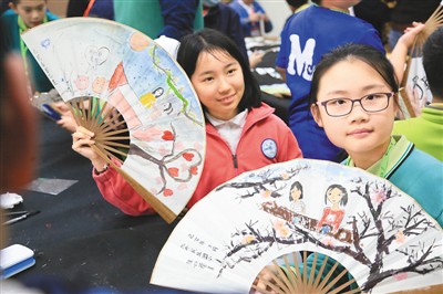 兩岸和平小天使在臺(tái)北民族小學(xué)的特色藝術(shù)課程上繪制扇面。