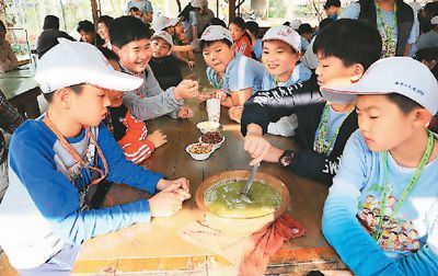兩岸和平小天使在新竹北埔麥客田園體驗(yàn)制作擂茶。