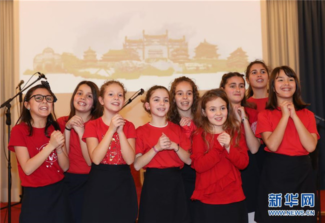 這是2019年2月8日,在意大利拉齊奧的古鎮(zhèn)蒂沃利,蒂沃利國立住讀學校的學生們在中國春節(jié)慶?;顒由辖o大家拜年。 新華社記者 程婷婷 攝