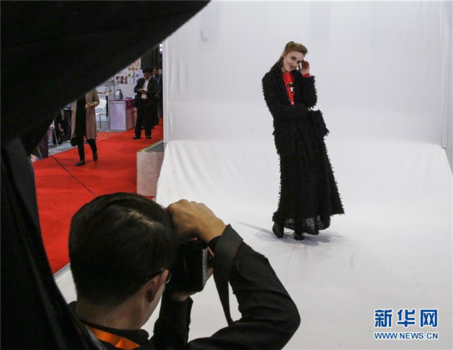 這是2018年11月9日,在中國上海的首屆中國國際進口博覽會上,模特展示意大利時裝。 新華社記者 張玉薇 攝