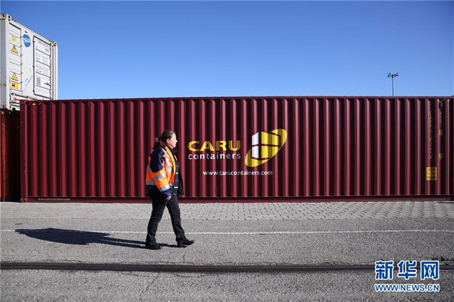 這是2019年3月5日,裝載有中國商品的集裝箱從中國武漢發(fā)出后,經(jīng)由中歐班列運輸?shù)诌_法國里昂。 新華社記者 唐霽 攝
