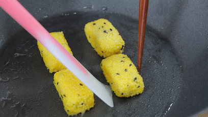 *這里和平時(shí)做小餅不一樣,四面都要翻,全部煎至金黃哈。