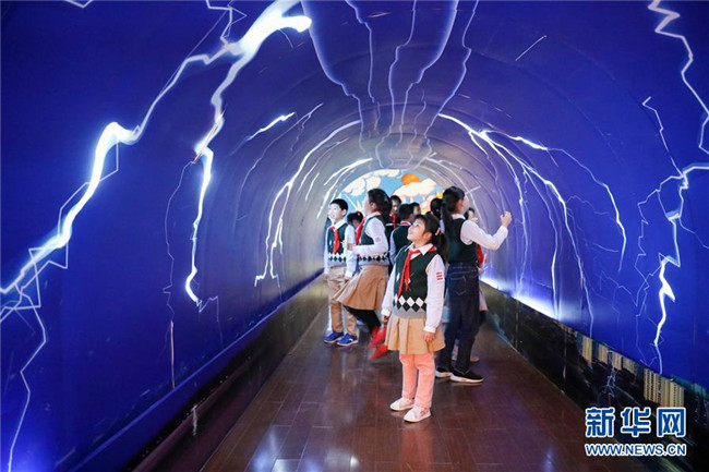 3月22日,學(xué)生在合肥市氣象科普館體驗(yàn)?zāi)M的雷電場(chǎng)景。