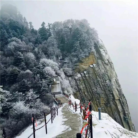 量掌山雖矮于華山主峰,但山峰險(xiǎn)峻,危崖聳立,崖體裸露呈赭色,巖石皴理異常美麗,其造化之妙如出畫(huà)家之手。尤其是在陽(yáng)光照耀下,更加燦爛輝煌,雄奇壯觀。攀登量掌山的道路非常險(xiǎn)峻,古時(shí)除一些羽林高手外,很少有人登峰。