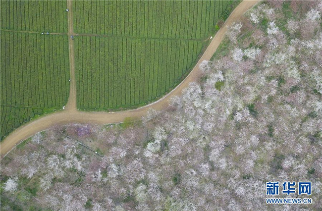 這是3月27日拍攝的貴州省貴安新區(qū)櫻花觀光園的櫻花和旁邊的茶園(無人機(jī)拍攝)。新華社記者 陳曄華 攝